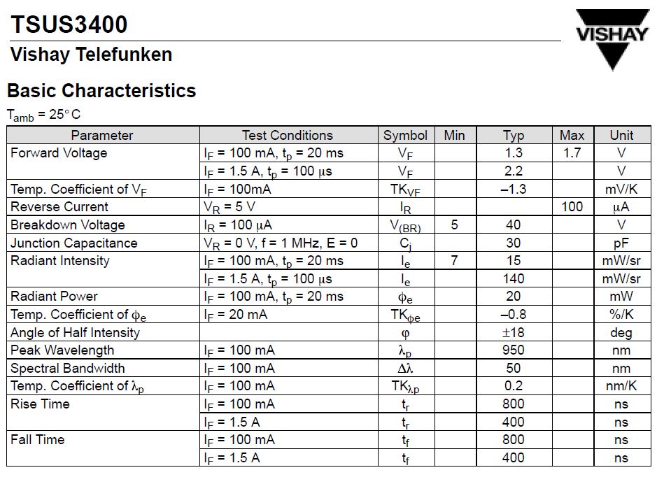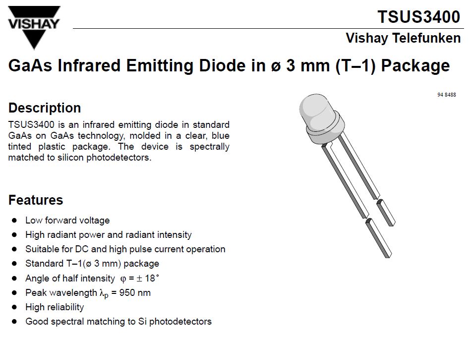 IR Emitter and IR Receiver 3mm 950nm TSUS3400 S295P TELEFUNKEN